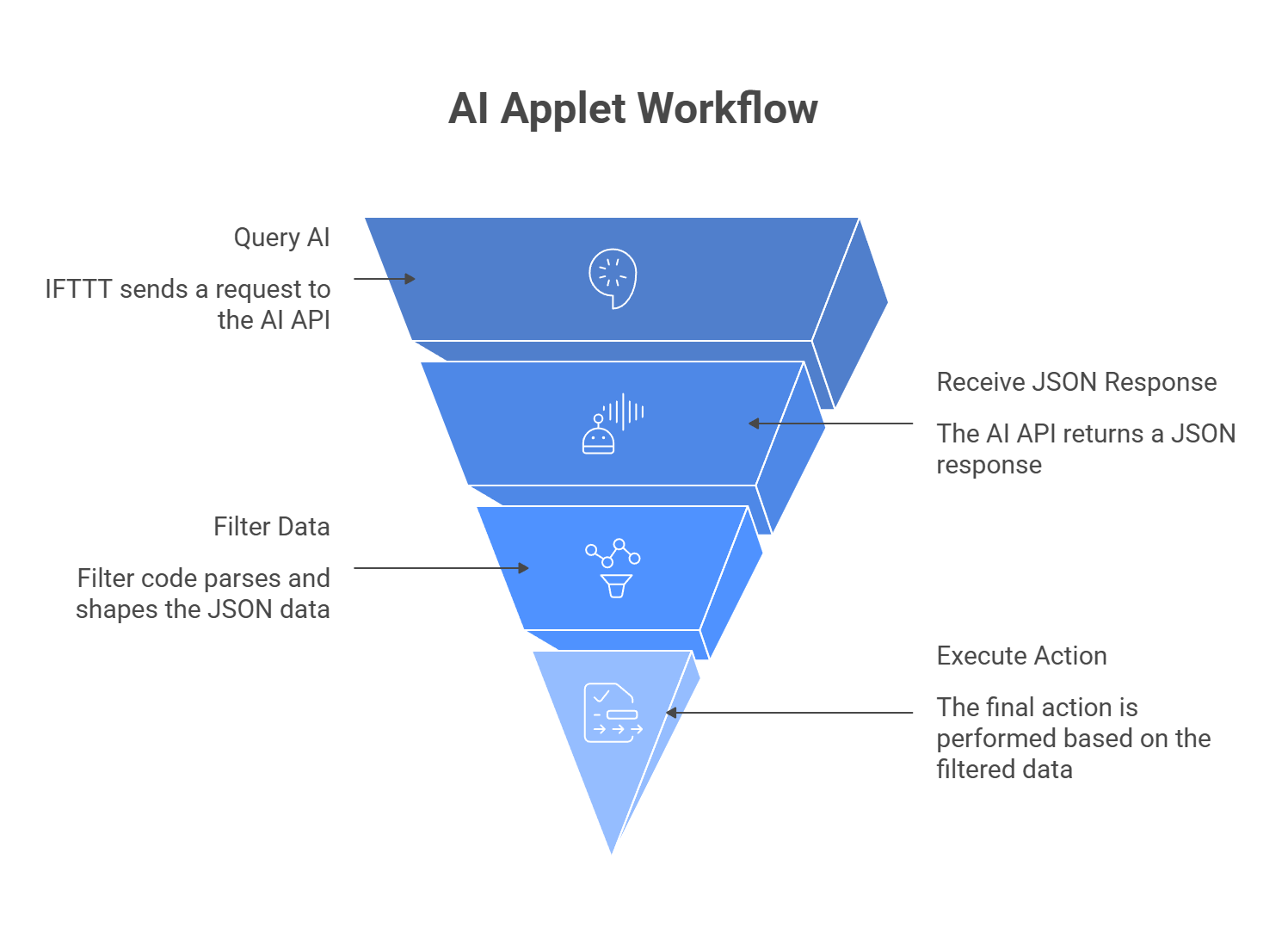 If you want IFTTT to do more than a basic two-step automation, you need a slightly smarter setup. The usual pattern is not just If This, Then That. It is more like: something happens, IFTTT asks the AI for help, filter code cleans up the response, then the final action runs. IFTTT’s own docs describe Applets as flows built from triggers, queries, and actions, and its Webhooks query with JSON response is designed to return the JSON body so you can parse it with filter code.