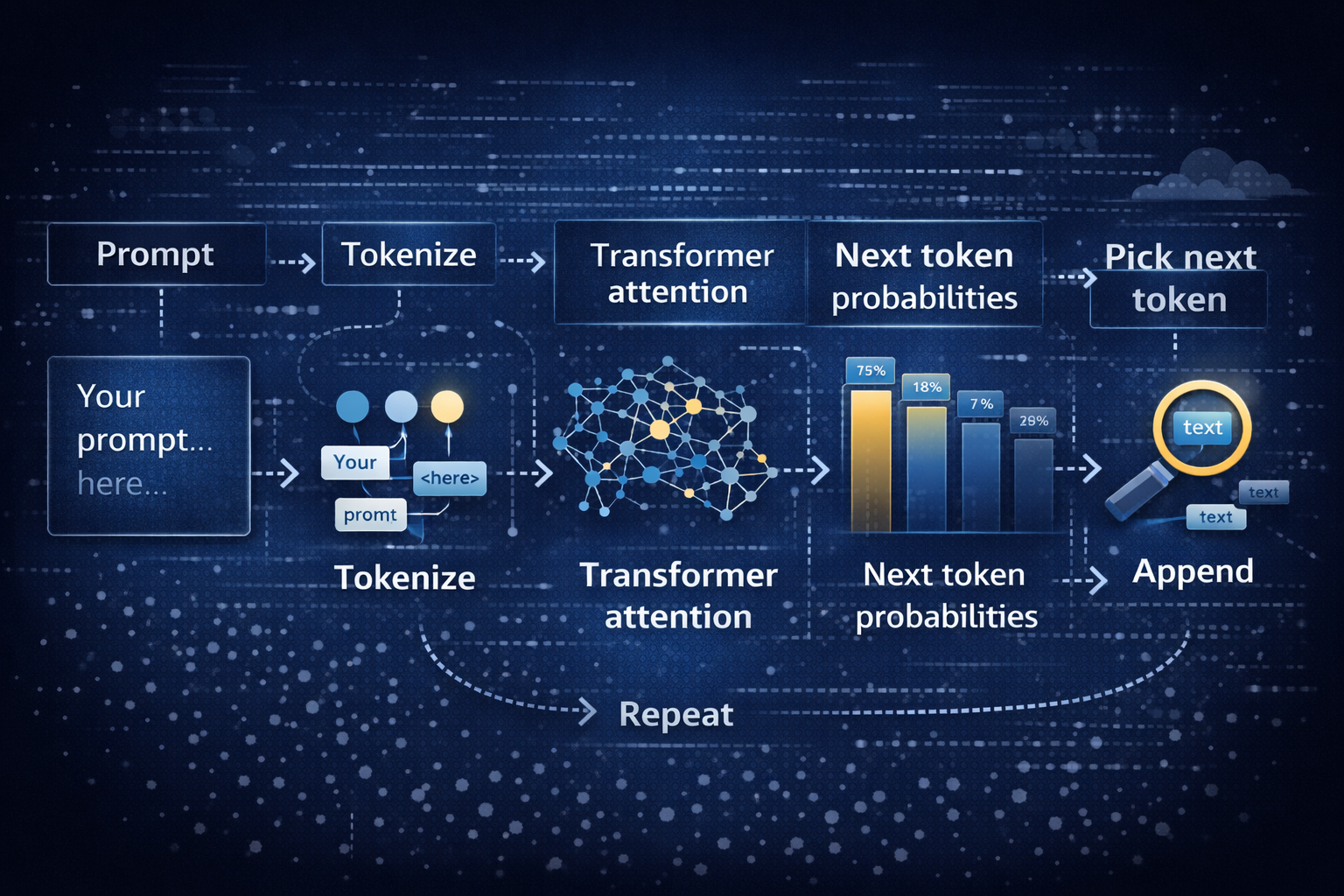 A tiny example: if you prompt, “Git is a distributed version control”, the model tends to continue with “system”. It’s not looking up a definition. It’s predicting the next likely token based on patterns learned from a massive dataset.