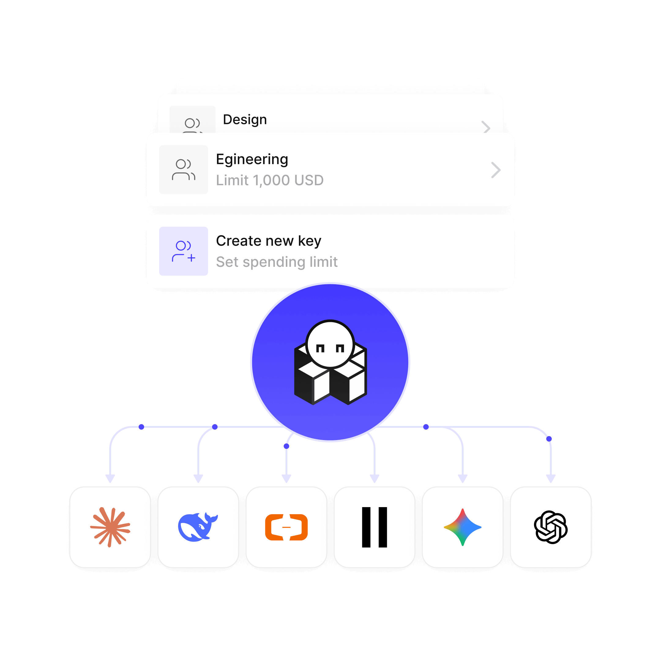 Replace scattered provider accounts with a single API key. Invite your entire team in a single click and assign them their own keys.