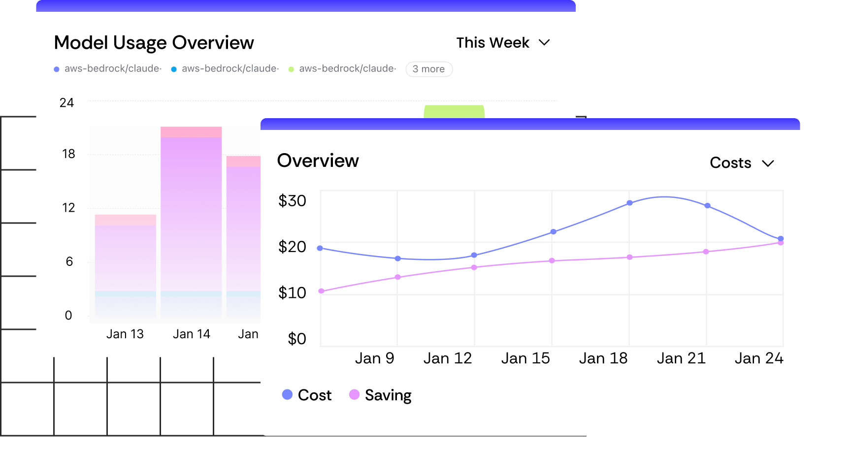 Requests, tokens, inference cost, savings, avg cost per 1K tokens. Broken down by model and provider.